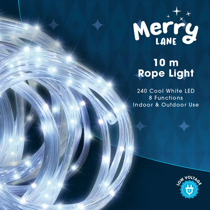 Bring brightness and charm to your space with the Merry Lane 10m LED Cool White Rope Light. Designed to offer both functionality and style, this versatile rope light is ideal for a wide range of applications, from highlighting your garden path to framing patios, decks, and balconies. Indoors, it can be used to accent shelves, staircases, or entertainment areas, creating a warm and inviting ambience.