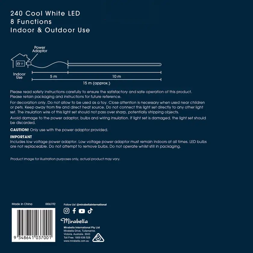 With 240 energy-efficient cool white LEDs evenly distributed along its 10-metre length, the rope light delivers a crisp, modern glow that enhances any setting. Its 8 multifunction lighting modes let you tailor the atmosphere—whether you want a subtle, steady illumination for quiet evenings or dynamic flashing patterns for festive occasions.
