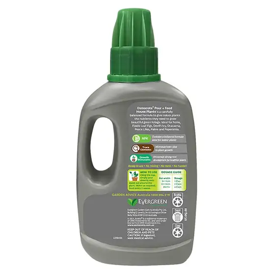 Scotts Osmocote Pour+Feed for House Plants is a ready-to-use liquid fertiliser that is formulated to give your plants the nutrients they need with visible results in just 7 days! A carefully balanced blend of nitrogen, potassium and phosphorus will keep your plants thriving for weeks. It’s simple to use with an easy pour measuring cap which means no mixing, no mess and no fuss. Simply pour a capful directly onto moist potting mix around the plant. Water as required. For best results, feed every two weeks. Suitable for all indoor plant varieties including Ferns, Fiddle Leaf Figs, Devil’s Ivy, Dracaena, Peace Lilies, Palms and Peperomia.