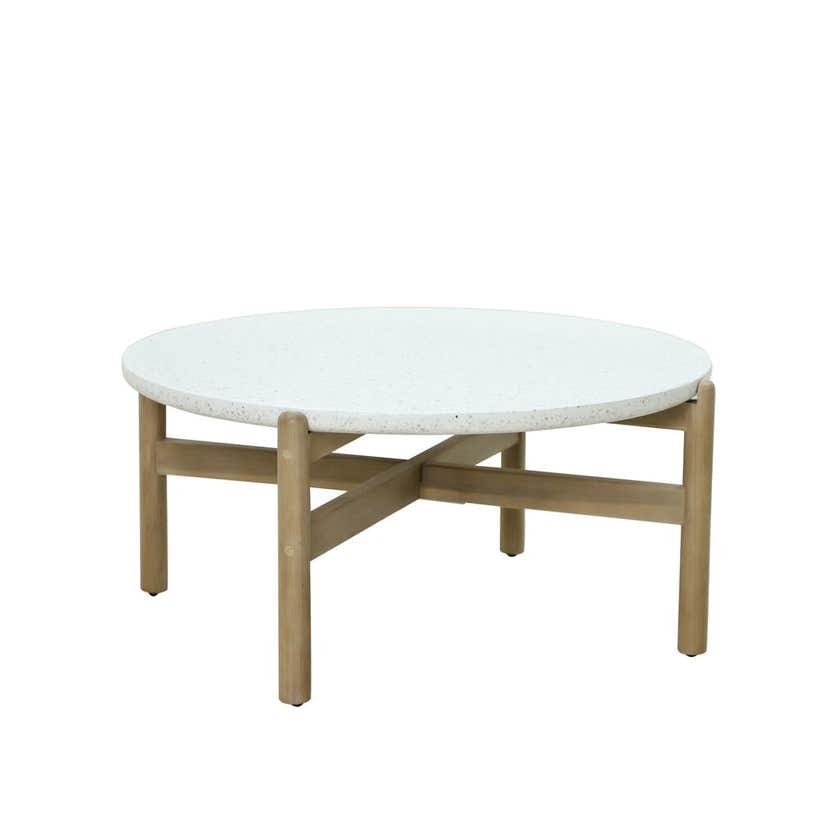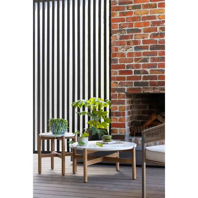 The Terrazzo Side Table with an 800mm diameter is a stylish and versatile addition to any living space. Crafted with precision and attention to detail, this side table combines functionality with a touch of sophistication. This versatile side table features a designer white terrazzo tabletop and an FSC acacia leg frame. The low height with large tabletop diameter is suitable for indoor or outdoor use, or team it with the 50cm Terrazzo Side Table for a decorative table set. Elevate your living space with the Terrazzo Side Table, where form meets function in perfect harmony.