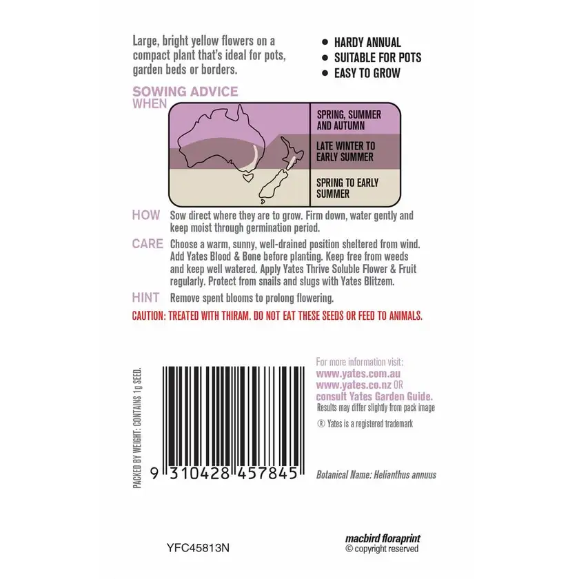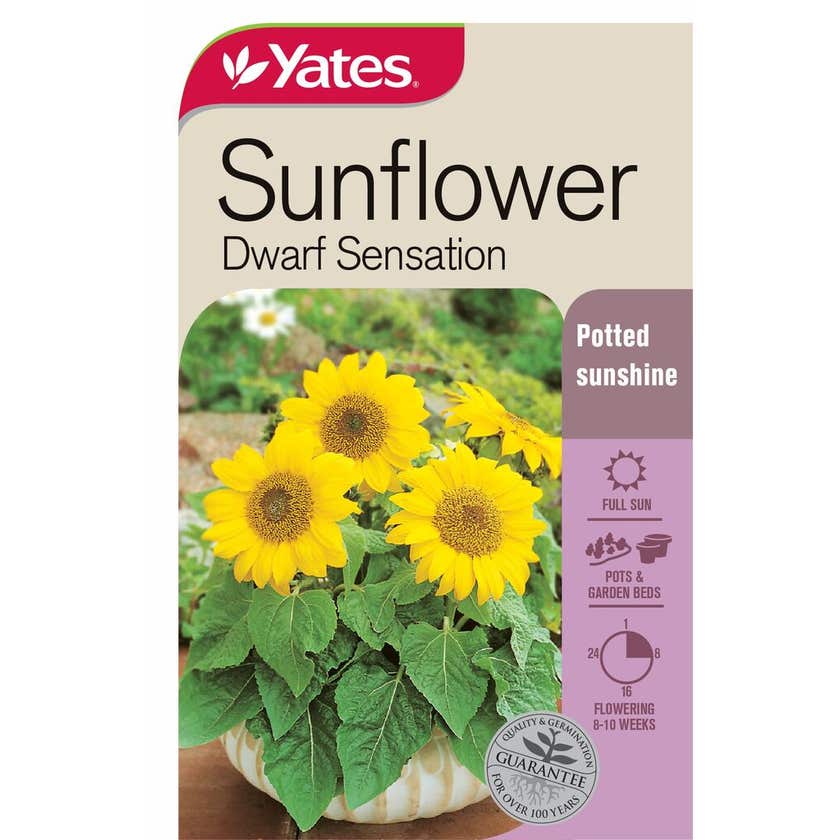 Bringing a burst of golden sunshine to any space, Yates Sunflower Dwarf Sensation is a compact yet vibrant addition to gardens, pots, and borders. With its large, bright yellow blooms, this hardy annual creates a striking display without requiring extensive care. Perfectly suited for smaller spaces, it thrives in pots, adding warmth to balconies, patios, or courtyards. Its easy-to-grow nature makes it an excellent choice for beginner and experienced gardeners alike, providing a rewarding and cheerful presence throughout the season. Whether planted in garden beds or containers, these sunflowers flourish with minimal effort, bringing joy and a touch of nature’s beauty to any setting.
