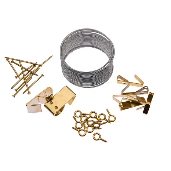 • Includes 8 angle drive hooks, 10 nails, 12 screw eyes, and 3 metres of zinc-plated picture hanging wire