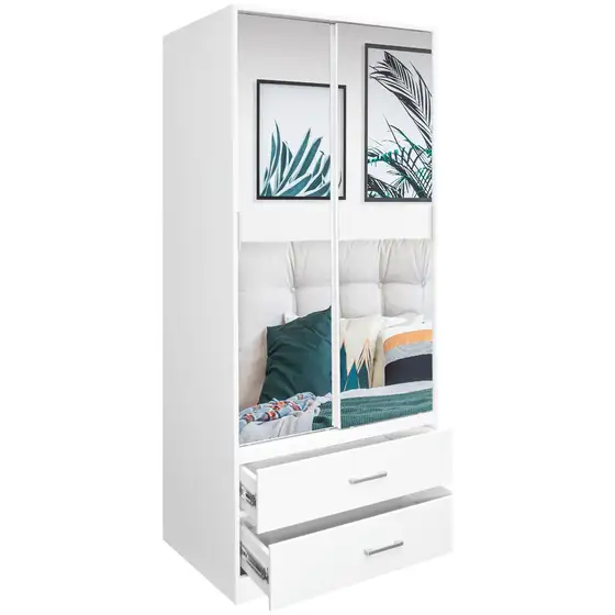 The Faulkner 2 sliding mirror doors and 2-drawer wardrobe is an elegant and functional storage unit that offers ample space for clothes and other items. With a width of 800mm, it can fit comfortably in most bedrooms without taking up too much floor space. The unit comes in a beautiful white finish with 2 mirror doors that will complement any decor style and add a touch of sophistication to the room.