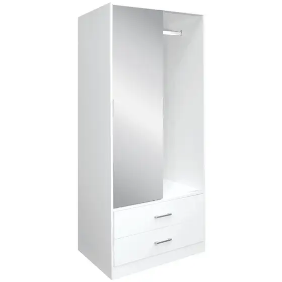 This simple-to-build, pre-drilled wardrobe unit provides ample wardrobe space and a hanging rail for coat hangers with features including two sliding mirror doors with handles. This wardrobe unit is made with a solid 16mm white finish wearing melamine board and 2 heavy-duty roller drawers with base support for added storage along with 1 fixed shelf. The large clothes hanging area is 1320 x 770 525mm which is ideal for creating extra bedroom storage space.