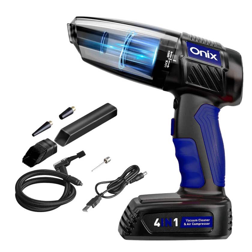 Tackle mess, maintenance, and emergencies with the Onix 4-in-1 Multi-function Vacuum Inflator Blower – your reliable all-rounder for car, camping, and home use. This compact yet powerful cordless device functions as a vacuum cleaner, air compressor, blower, and LED emergency light, making it an essential addition to your toolkit.